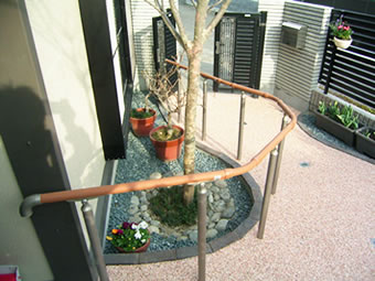 K様のお宅は、玄関ポーチから門扉までの距離が比較的短い為、この空間でスロープ、手摺り、そして植栽等のレイアウトをどうすればベストなものになるかを考えました。幾つかのプランの中から、アプローチの距離が長くなる楕円型のデザインに決定。このデザインにより最も優先したかった勾配の緩やかな安全性の高いスロープが出来ました。スロープ面はリンクストーンという滑りにくい石を敷き詰める事により雨の日も安心して歩行する事が出来ます。また、屋外手摺りも滑りにくい樹脂性のものを設置。この手摺りは外気温に左右されにくく、やさしい感触が特徴です