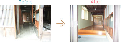 | すぐ左に階段があり、土間がずっと奥まで続き、少しせまく暗い印象の玄関でしたが、土間を和室と同じ高さの廊下にして、広くて明るい玄関へと変わりました。奥に見える粋な格子戸や梁の見える天井など雰囲気は変わっても趣きは残っています。 |